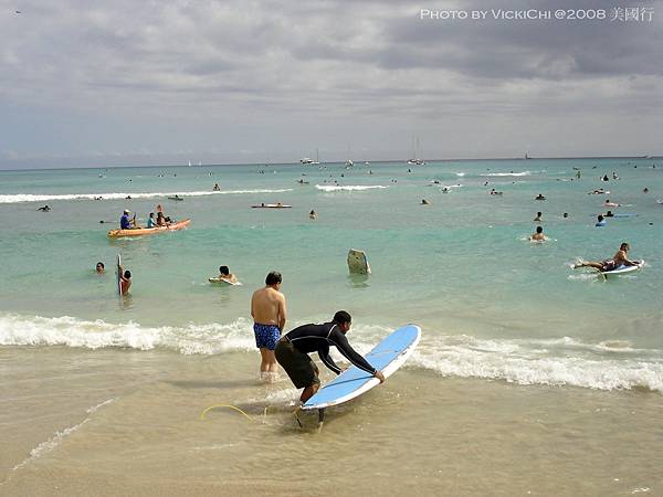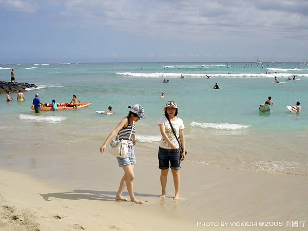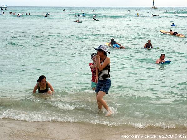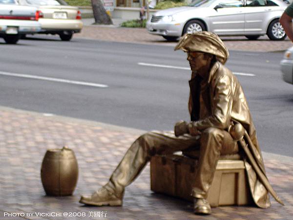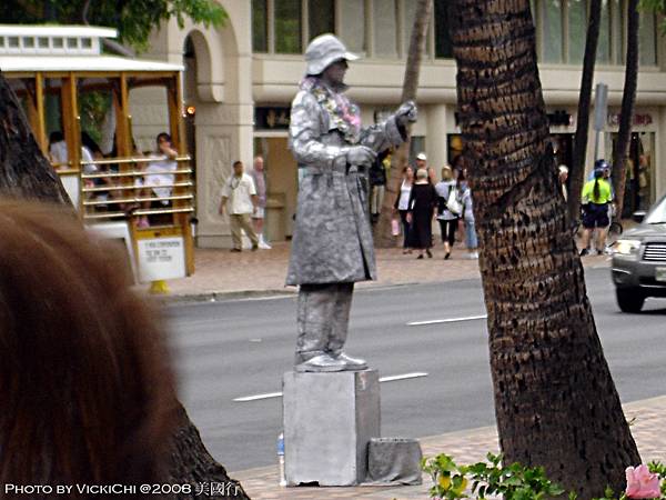 途中,我們在路上也看到了街頭藝人把自己扮成雕像,在街上表演。不過一心前往Waikiki海灘,感受一下夏日海灘風情。拍了照片就繼續往前走,走了約15分鐘,終於來到海灘。