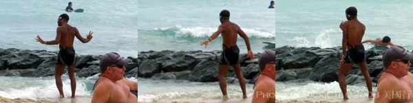 看著白色沙灘和比基尼女郎。腳踩在沙灘上,任海水拍打我的雙腳,在短褲濕透時,整個人已經在海水裡。在沙灘上拍照玩耍,我也在沙灘上看到觀察前來戲水的遊客們,注意到前面的男生,非常自得其樂在沙灘上跳舞。