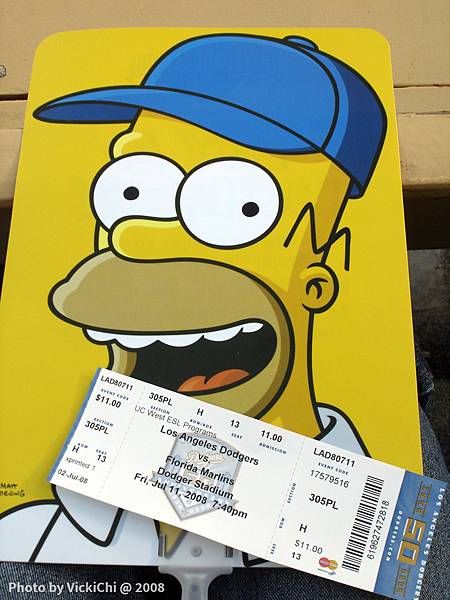 領到入場票,我還拿到辛普森家族的黃色扇子,扇子上的辛普森也戴藍色的帽子,把扇子跟入場票一起合影,後來也把扇子帶回台灣做紀念。