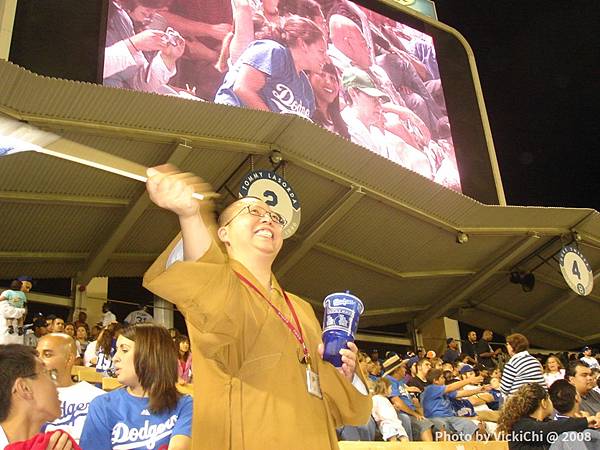 然後,我轉頭突然看到我們家的師父正在搖起吶喊,人家電影上演的是《修女也瘋狂》,我在這裡見識《師父也瘋狂》的一面,一向莊重的法師,也敵不過棒球的魅力,跟著一起開心的揮旗子,經典畫面!
