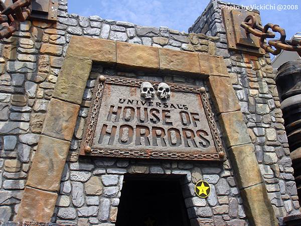 進入環球影城後,我們先到恐怖之家(House of horrors),這一看就是鬼屋探險。遊園地圖上寫著這裡有聚集了所有恐怖電影裡面的主角,沿著城堡的吊橋走進去恐怖之家,進去的時候,冷氣像是不用錢一樣,超冰涼的。看著櫥窗展示,感覺還好,只是環境很黑暗,沒有很嚇人,我會害怕的一定是我自己嚇自己。結果被前面的尖叫聲嚇到,接著轉過頭又被會動的鬼娃嚇到大叫,結果我一叫,我後面的人也嚇慘...
