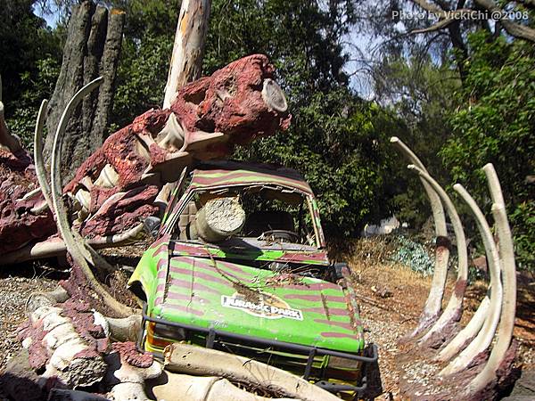 後面就是《侏儸紀公園》(Jurassic Park)裡面的使用的車子,然後車子往前開,出現小恐龍對著你噴水。