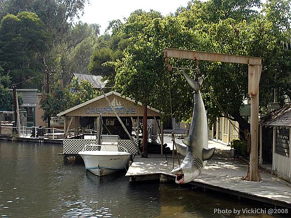 電影《大白鯊》(Jaws)的場景,假鯊魚看起來兇猛貌,真的很逼真!!平靜的水面,突然有隻大白鯊突然出現,竟然還有大白鯊的音效,接著毀掉碼頭。然後,我被大白鯊的水濺到了...