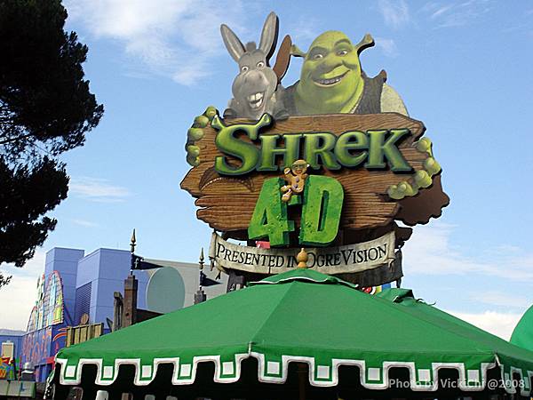 超火紅的史瑞克四D動畫館,排隊排超長的。一進去要拿綠色特製的眼鏡,站著聽三隻小豬和小木偶在空中說話,聽完就進去一間小戲院。永遠忘不了開場那隻驢子的噴嚏,在他打噴嚏時,就會有水在眼鏡上。不過水加上情境就是噁心,不過挺有趣的,椅子還會配合劇情晃動。