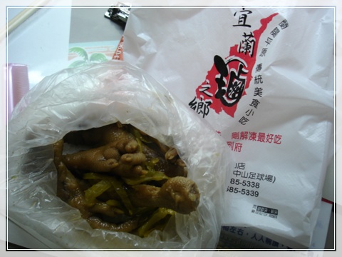 礁溪的宜蘭滷之鄉,每次搭車經過的時候,這間店總是人潮不斷。走了幾次以後,想買來試試味道,進去的時候看到價錢,比起平常在傳統市場的雞腳2元的那個時候,看到這裡一隻10元,就有一些猶豫,但是一看到上面寫著全國唯一冰釀滷味,決定買幾隻雞腳和鴨腳來試試味道。