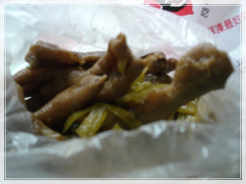 雞腳比起一般的冷雞腳就是不一樣,更有咬勁,還有一點辣辣的味道。鴨腳,雖然吃得很不習慣,但是吃的感覺還不錯!10元一隻的雞腳,對於一個大學生,算是一種小小奢持。這裡離湯圍溝的泡腳池非常地近,可以買點滷味,那裡邊吃邊泡腳,但我只有想而已......