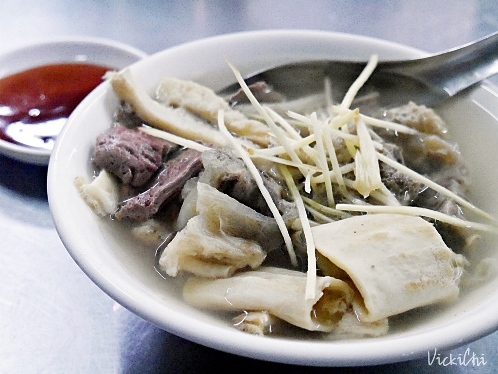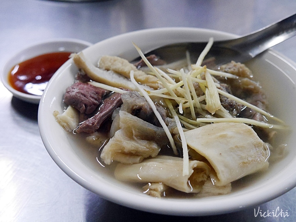 邊喝湯邊沾醬汁和薑絲一起,一大碗的牛雜湯,有牛腸、牛心管、牛筋肉、牛腸子、牛肚滿一大碗的牛雜湯,清燉的湯頭有著牛大骨的濃郁香氣,沒有複雜的肉腥味,喝起來相當清甜。店家還提供免費加湯的服務,續了兩碗湯,覺得非常滿足!