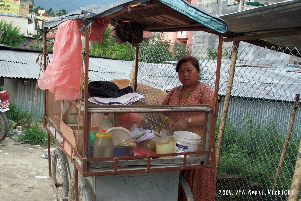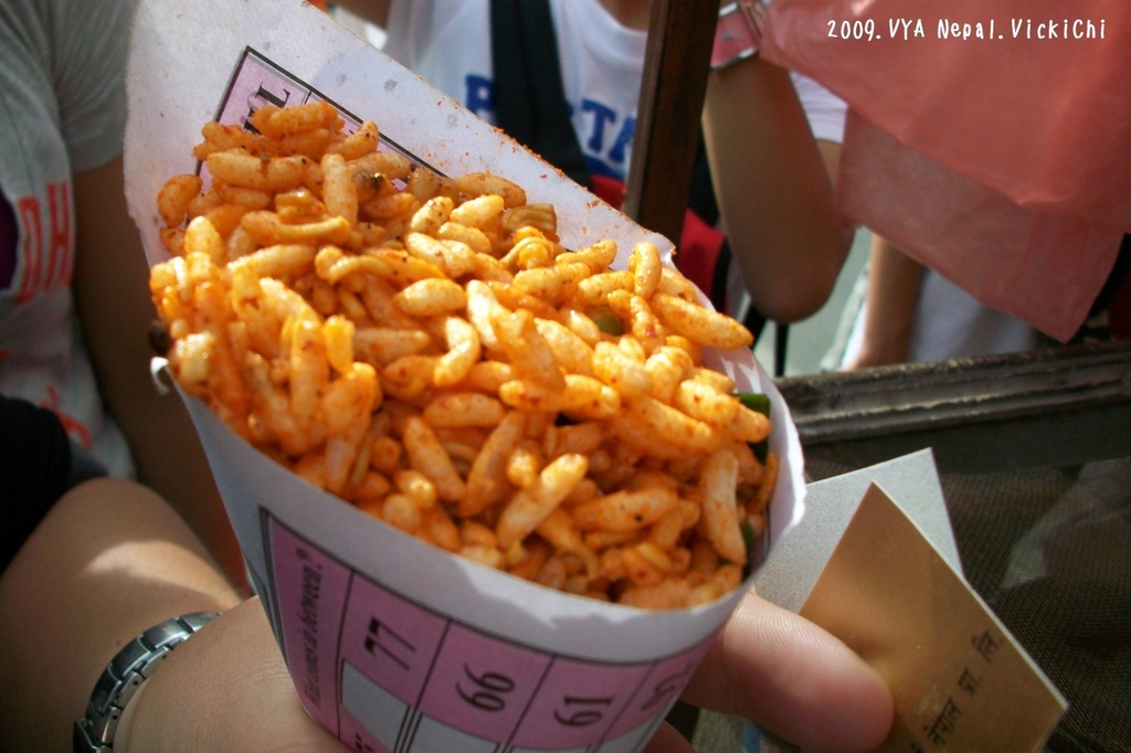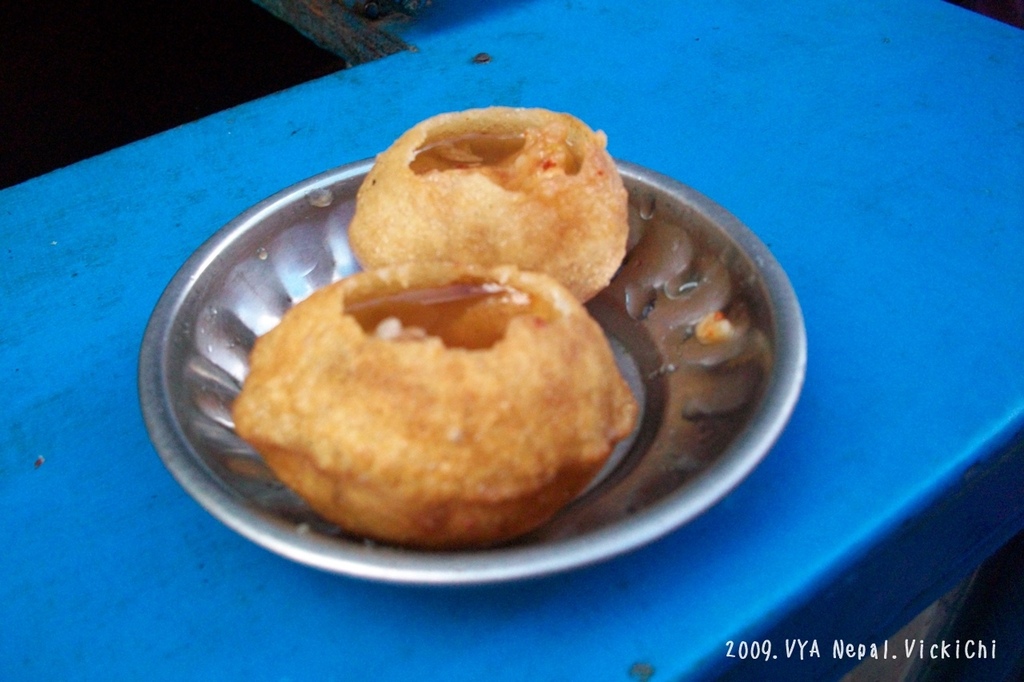 第一個路邊小吃,就是抵達加德滿都,把行李放在NIFC-Nepal的中心後,一拿到尼泊爾盧比,就跑到大街上閒晃,剛好碰巧當地小學放學,路上有賣Golphuki(葛普齊)小販。