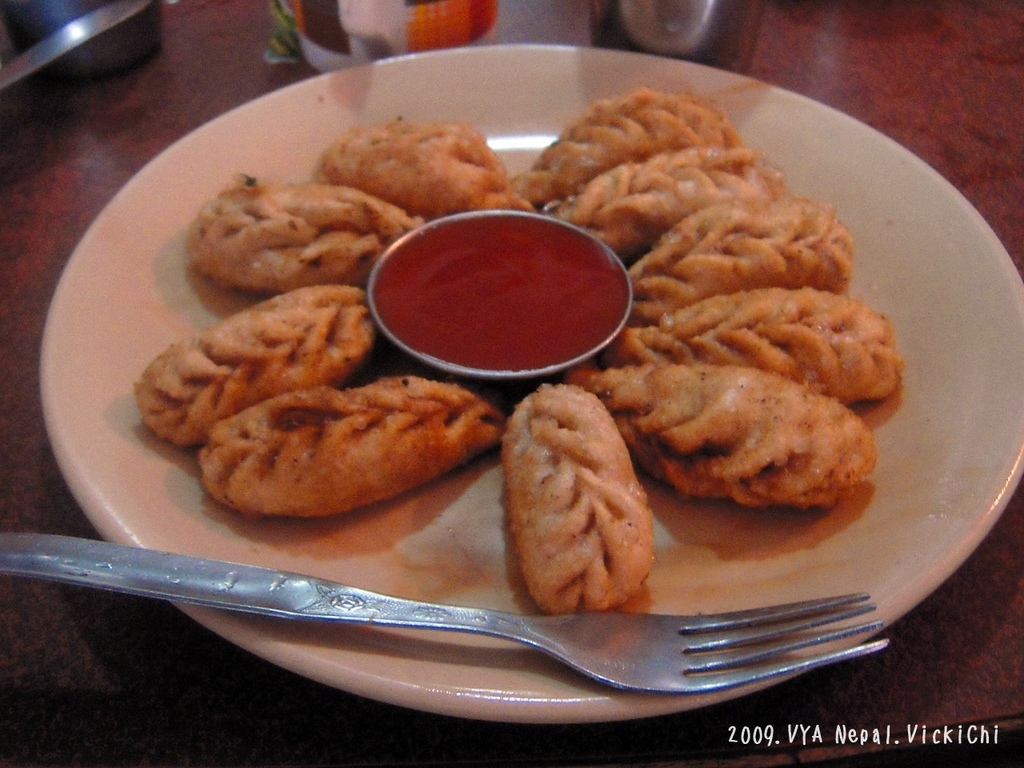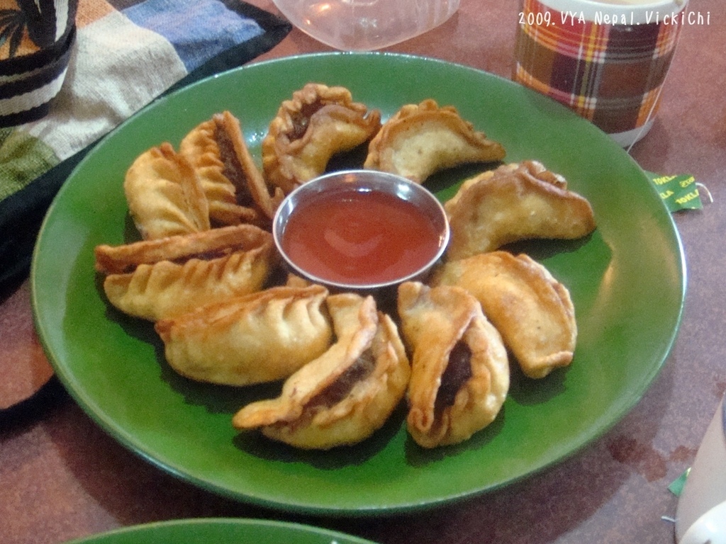 尼泊爾的餃子叫做Momo,我們在「Newa Kitchen」品嘗到Momo後,往後只要有休息時間,就會下山來這裡來吃Momo。旅遊書上寫到關於摩摩約20~40盧比,我忘記在這裡具體的價錢,好像比較貴一點點。據說是從西藏傳到尼泊爾。有雞肉、水牛肉(當地人不吃黃牛肉)、豬肉及素食口味。Momo烹調的方法也不一樣,有蒸的和炸的。蒸的Momo最合我的胃口,店內的沾醬跟辣醬真,吃起來非常過癮。