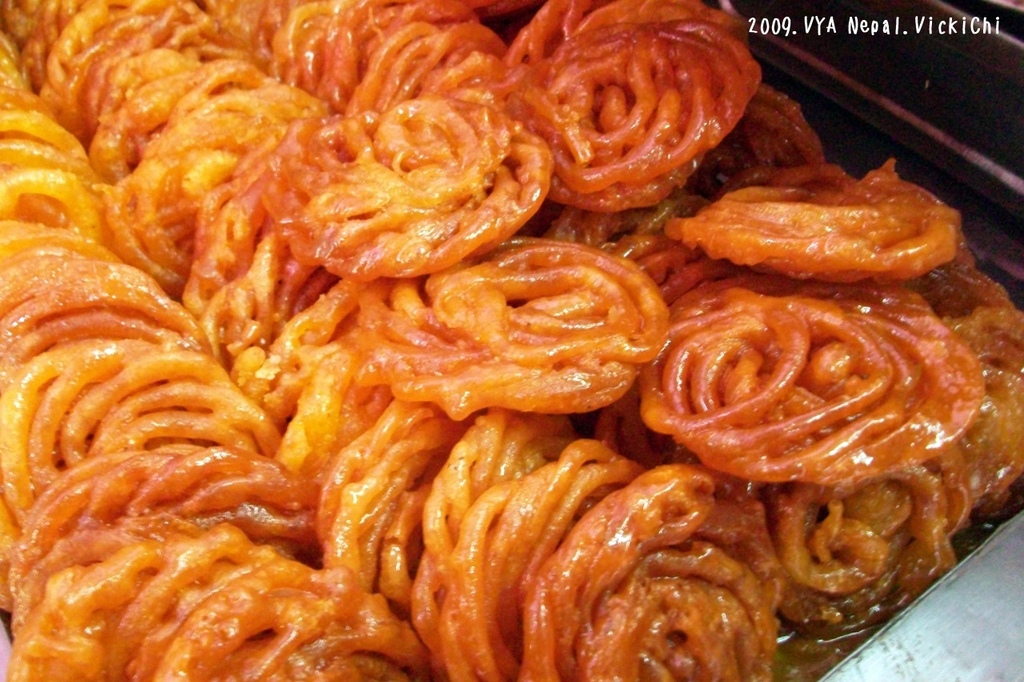 Jalebi在印度、尼泊爾很常見的甜食,是用炸好的麵糰再用糖漿浸泡。裹著糖漿,超甜的!配上熱奶茶,好吃。