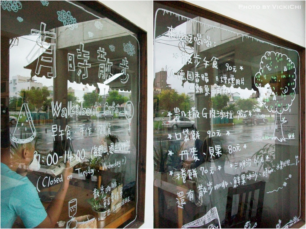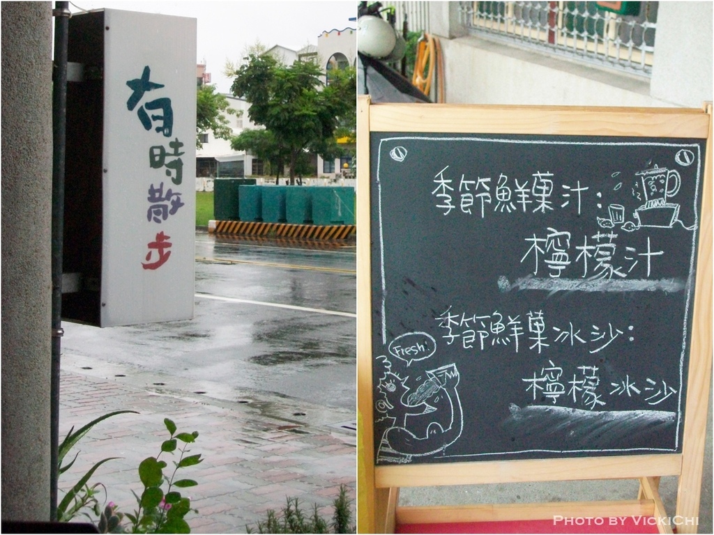 早上要出門的時候,外面還在下雨,絲毫不減我們的興致。一行人撐著雨傘,從民宿走在南京路上的有時散步咖啡館,有時散步的招牌很小,由於店外面的玻璃窗戶上寫著餐廳的訊息和簡易菜單,而我被擺設在外面的一些手作的佈置和木製的小黑板吸引,讓我一眼就認出來。
