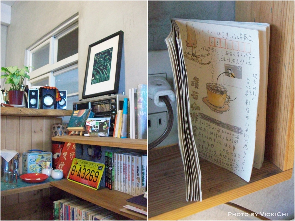 簡單的室內佈置,水泥樣貌的牆壁和用水泥塊疊成的書架擺的書籍,餐桌和吧台,隨意擺放的手作物品,都讓人覺得輕鬆隨興。