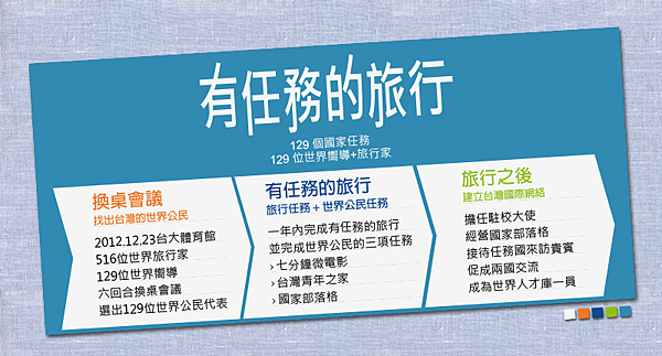 簡單介紹「有任務的旅行」。這次世界公民島提供有129張台灣免簽證國的機票,在這129個國家世界公民島會邀請129位台灣領袖提出一個國家任務,旅行家必須在這129個任務中,挑選出6個跟自己的人生主題相關的任務,完成六國旅行計畫。
