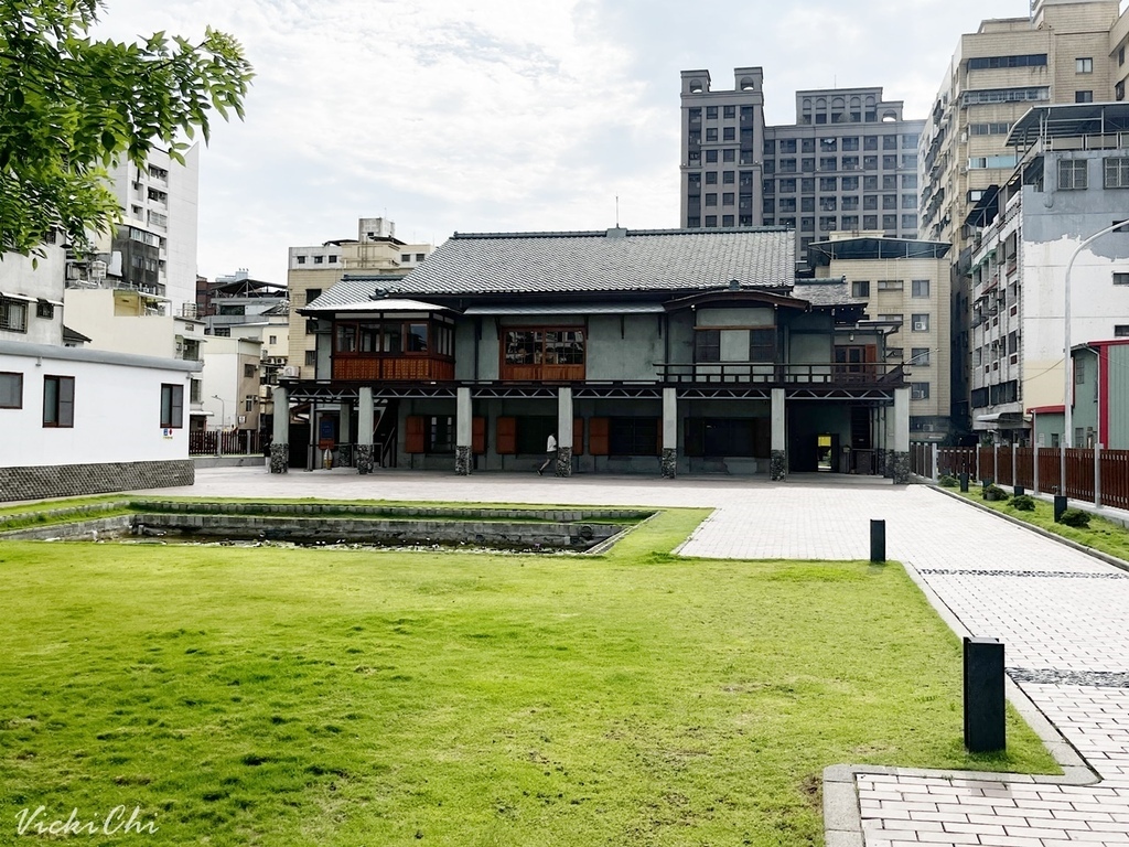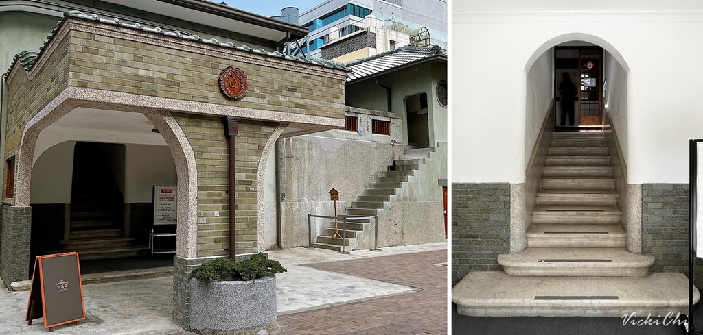 昔日逍遙園的前方有寬敞的車道通往大門,其餘三面都有水池圍繞,庭院還可見苗圃、防風林、假山等造景,體現閒適莊園生活的場域設計。觀賞車寄上方的「西本願寺大谷家紋」的裝飾,剛好遇上定時導覽,於是,我跟著導覽員一起欣賞逍遙園的整個建築。