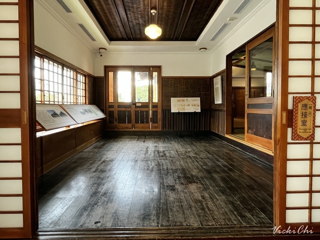 從樓梯走到2樓就是應接室,應接室就是等候室,這裡是接待短暫拜訪的客人,具有會客室的功能。大谷先生設計兩間,第一間稍微簡約,由此看出來,越往裡面,賓客等級越高。地板使用具有防腐性也能防止蟻類蛀蝕的台灣扁柏作為建材。