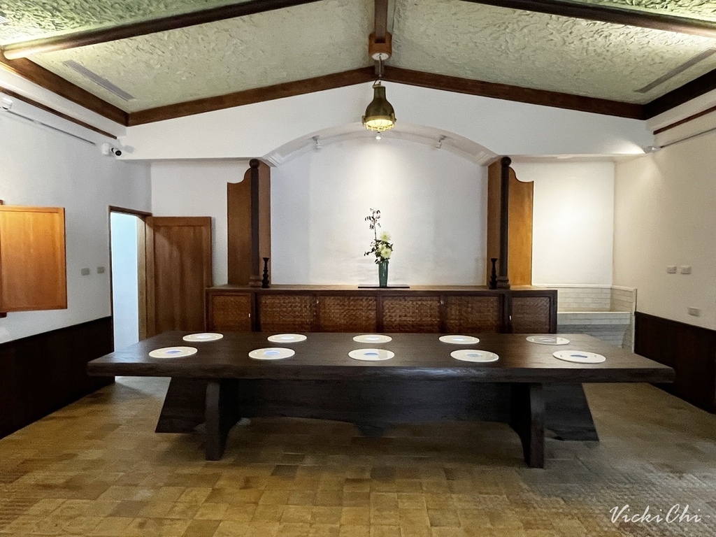 從應接室踏入小食堂和廣間,這裡主要是接待熟識的賓客,小食堂跟廣間是沒有隔間,用瓷磚地板和木地板做為區隔。從小食堂可以看到用來連接小食堂及炊事場的送餐口、餐桌和中亞風格的壁龕,旁邊設有用餐前使用的洗手台。小食堂的餐桌上投影了當時大谷先生最喜歡的歐式料理,除了招待賓客,大谷先生每天會邀請一位學生一起用餐,順邊關心學生的生活及學習狀況。
