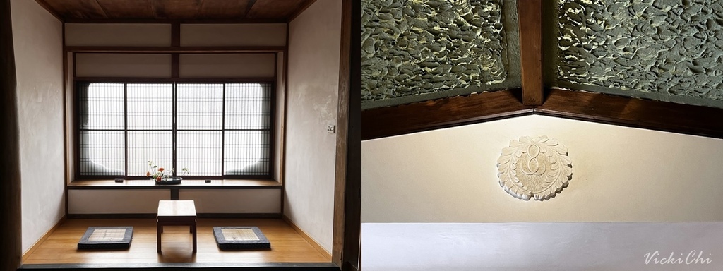 雅緻的「床之間」場域,懸掛字畫掛軸、花卉作為擺設裝飾,在床之間的上方還有加西本願寺大谷家紋,這可說是全台灣留存的西本願寺大谷家紋。