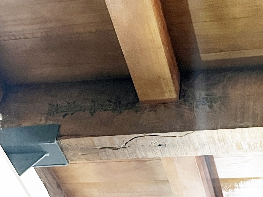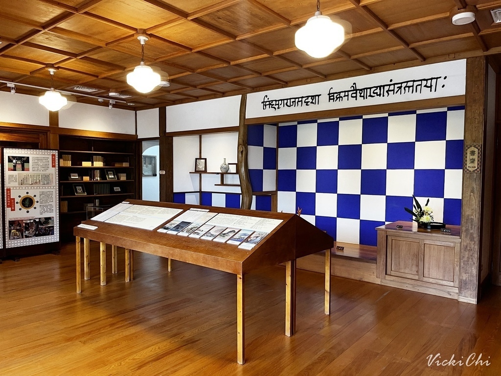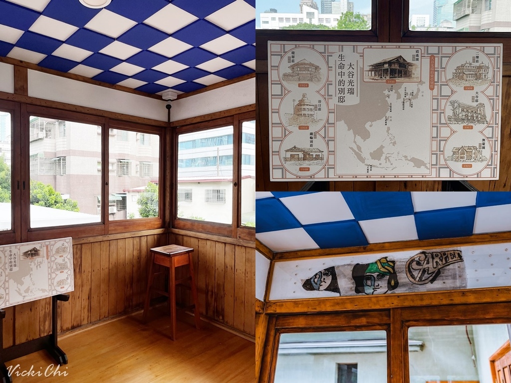 書齋旁邊的製圖室,採用大面積三面開窗,擁有絕佳的視野和光線,在當時可以遠眺中央山脈。在製圖室仰頭而望,天花板是顯眼的市松紋紋樣,還保存一面眷戶所畫「木匠兄妹樂團」的塗鴉。