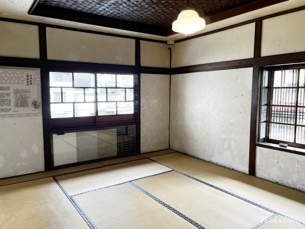 約五坪大的座敷,是大谷光瑞的女秘書居住空間,房間裡有典型的床間、床脇與押入的設計,整面的榻榻米搭配天花板有著精緻的龜甲狀的編織裝飾。在這裡可以看到整個逍遙園復原前和復原後的對比照片。原本想說,大谷先生跟女秘書們的房間會不會太近?後來才知道座敷的門是有特別設計,能夠保有女秘書們的隱私。
