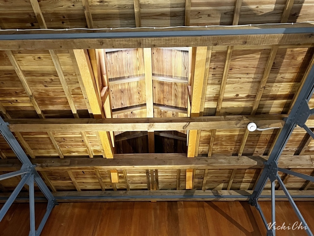整間廚房最厲害的地方,就是天畫板上有一座通風窗,用來讓室內空氣對流,在烹煮料理時不那麼辛苦的設計,運用配重平衡的原理,以繩索和滑輪可以操縱通風窗的啟閉。