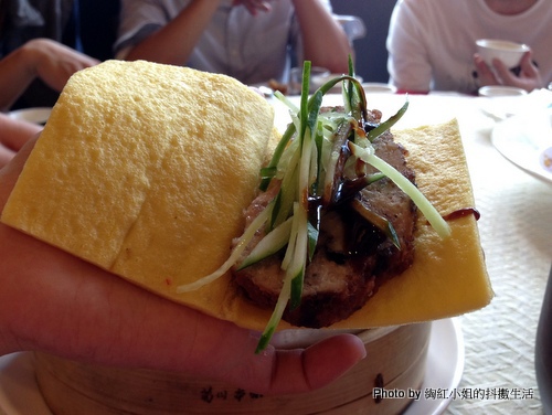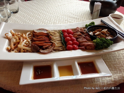 網站的介紹把鴨胸肉填入核桃仁、荸薺先蒸後烤後,搭配小黃瓜、甜麵醬夾餅食用。