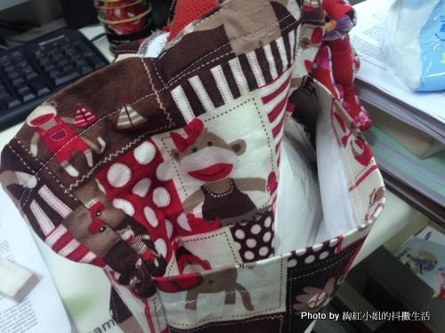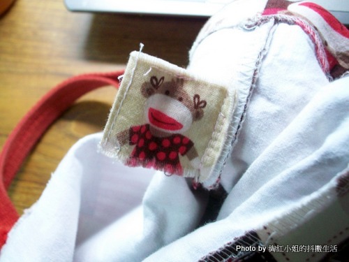 顆顆,剛好附近有朋友還有留一點點其他猴子款的布料,央求她給我剩下來的布料。我把它裁剪後,縫在內襯裡當步標。