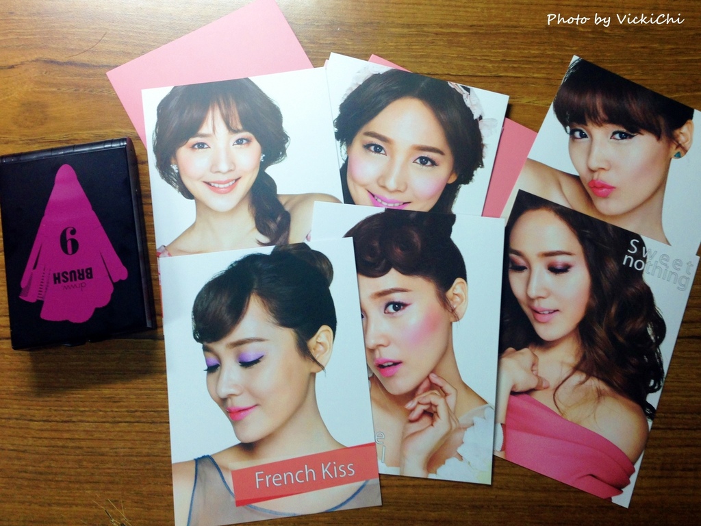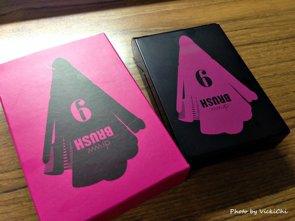 桃紅色的包裝盒和刷具組,刷具組的尺寸是12x7.5的大小,裡面有九枝不同功能的刷具。