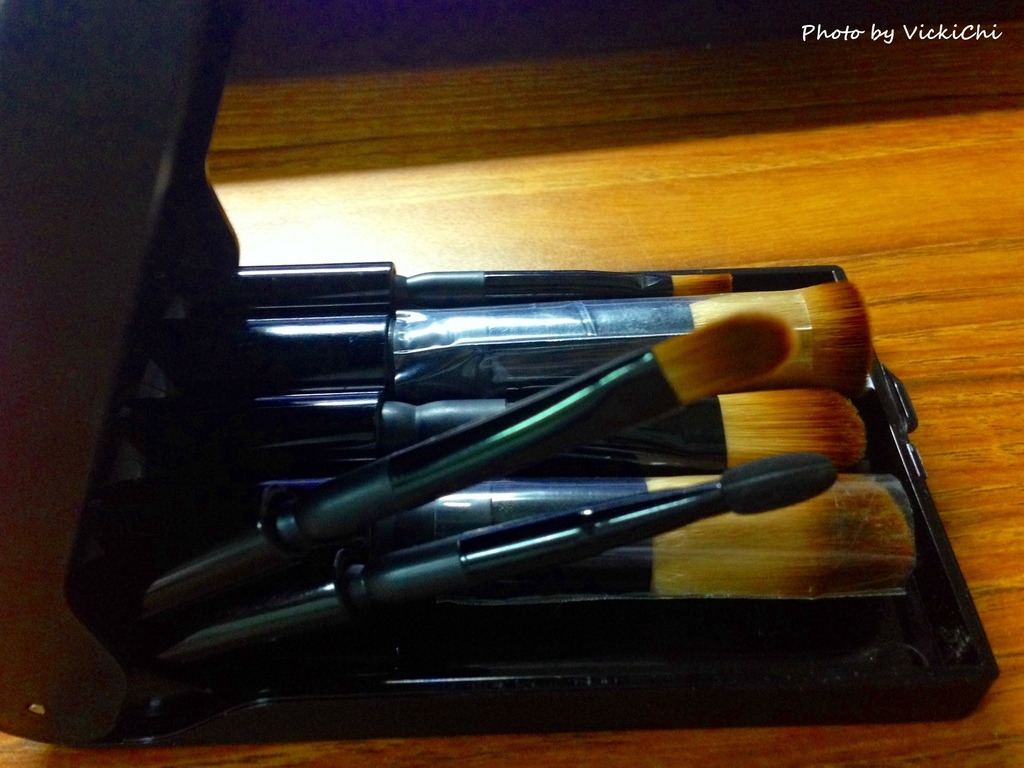 盒子設計成可以一打開整個刷具呈現180度的形狀,讓每一支刷具都有一個屬於自己放置位置,不會把刷具弄得很零散,也很容易收納和方便攜帶。這讓我想起小時候,在同學之間很流行那種有雙面的按紐開關,可以把蓋子彈起來的酷炫鉛筆盒。