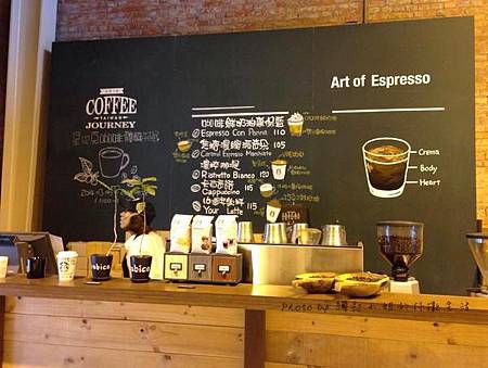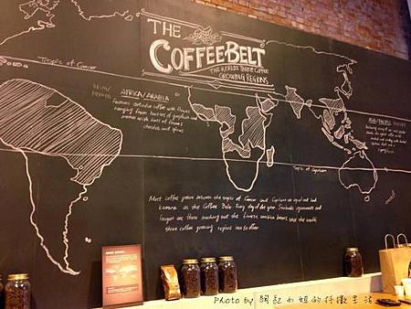 在櫃檯對面有一塊畫有世界地圖的黑板,上面標示著世界主流的幾種咖啡豆的產地位置。