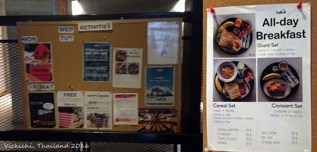 青旅的公告欄上,有各式各樣的活動可以參加,櫃台也有提供旅客在曼谷旅遊的資料和詢問,最特別的是二樓還有影片放映室,住宿期間,晚上都會看到有許多外國旅客在那看影片。這次住宿沒有附早餐,其實這裡可以訂早餐,我和旅伴通常都到外面吃,沒有吃過這裡的早餐。