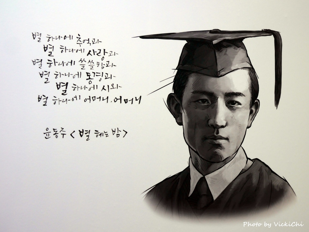 在樓梯間貼了幾位韓國作家的畫像,學了韓文後就會想看看能不能讀懂韓文書。從詩集開始比較不會有負擔,於是我認識尹東柱(윤동주),尹東柱是朝鮮獨立運動家,也是朝鮮半島近代民族文學代表性人物。韓國電影《東柱:時代詩情》就是在改編他的青春故事,找了姜河那來飾演他。不過在那個大時代的環境,看完就會覺得悲傷和壓抑,所以遲遲沒有去看。