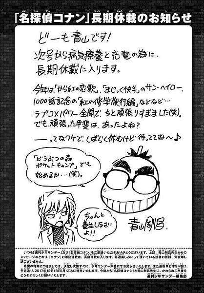 去年柯南在日本漫畫雜誌「週刊少年Sunday」連載23年,終於達到1000回,青山剛昌老師卻宣布因健康因素與充電等原因,柯南將進入長期休刊。希望老師好好養病,然後帶著柯南回歸!:-)