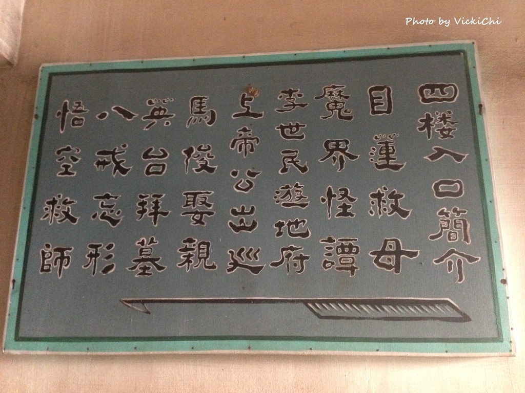 廟的入口處的告示牌寫著非常簡單的簡介,標示了每一層。一樓供奉東嶽大帝,東嶽大帝掌管十殿閻王,是幽冥的統治者。