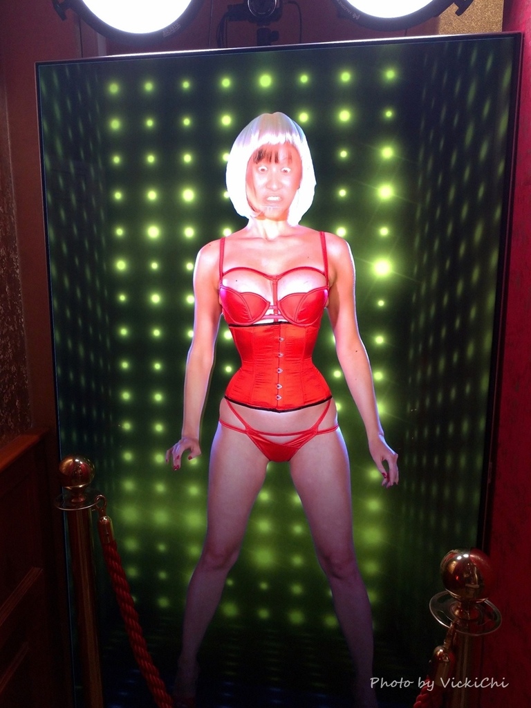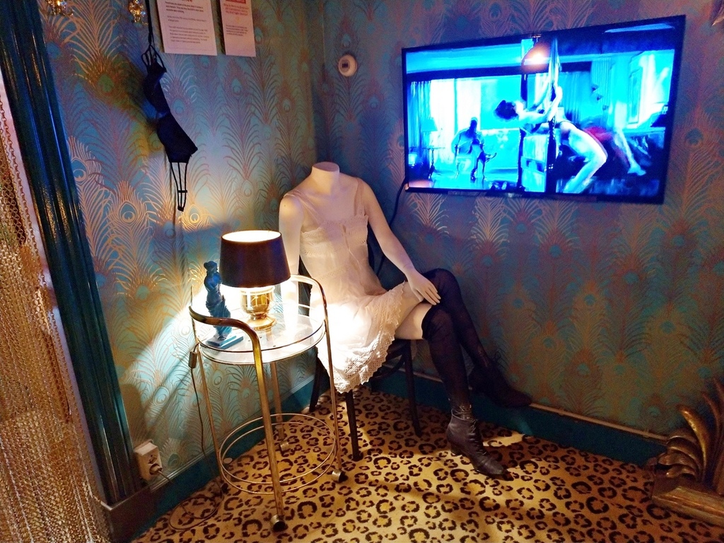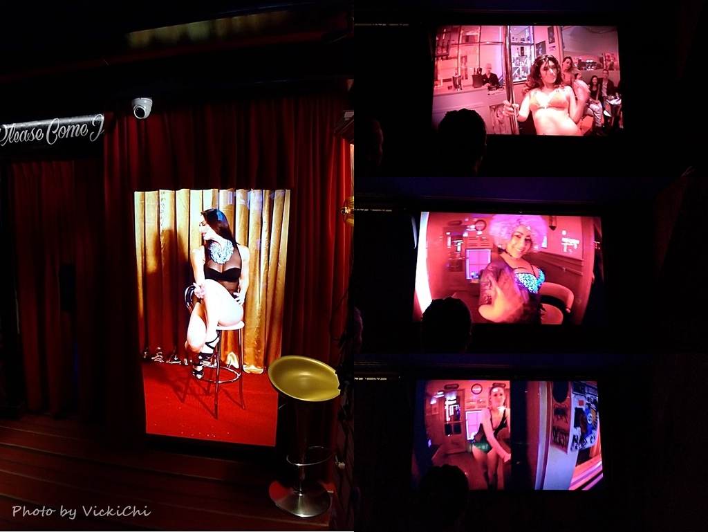 接著沿著牆上性感撫媚的女郎照片,走到盡頭有兩扇落地玻璃窗。這裡設計成紅燈區的櫥窗,我覺得應該是妓院原本留下來的櫥窗。