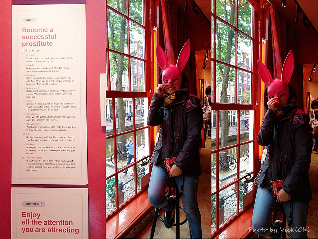 在這裡可以體驗性工作者在櫥窗裡面,看著櫥窗前走過的客人們的感覺。牆上還有怎麼站比較撫媚的教戰守則,感受一下坐在櫥窗內當櫥窗女郎的感覺。如果晚上到訪博物館,應該更有感覺。白天人不多,其實還好。 這裡還有面具可以遮羞用,很適合害羞的朋友。