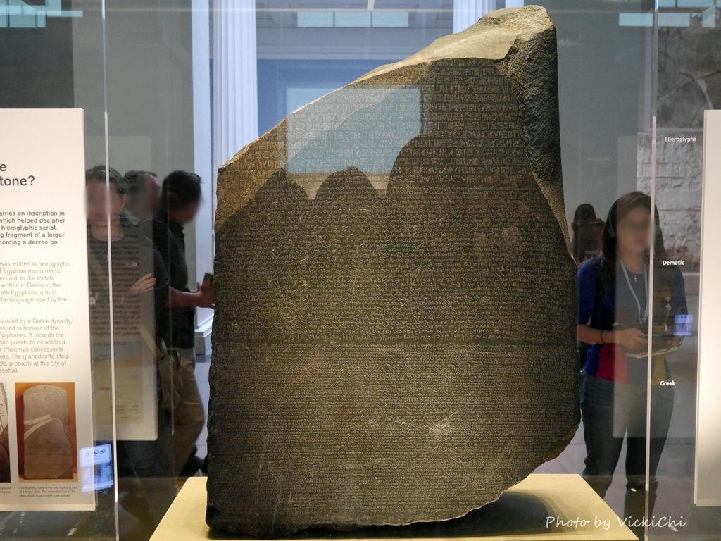 高114公分、寬72公分,厚28公分黑色玄武石「羅塞塔石碑」,是大英博物館的鎮館之寶。石碑是公元前196年托勒密王朝時代刻製的,碑文是頌揚在位第9年,年僅13歲的托勒密五世之德政。為了讓全國人民都看得懂,碑文用三種文字寫成:上段碑文是古埃及象形文,給埃及本土教士及官僚,中段是古埃及通俗文,給一般民眾,最後下段則是使用希臘文書寫,是給當時統治埃及的希臘人。