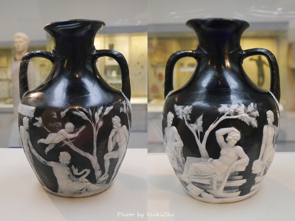 在17世紀的義大利一處皇墓石棺中發現這個,1810年被大英博物館收藏。浮雕玻璃花瓶,是羅馬時代留存下來最好的玻璃器皿之一,這個花瓶是用「寶石浮雕玻璃」的方法製成:將剛製作好且尚未冷卻的深色玻璃器皿浸入白色熔融的玻璃液中,以形成淺色的外表,然後取出,等冷卻後,立即除去表面白色玻璃層的多餘部分,露出深色的底色,形成淺浮雕狀的裝飾圖案。