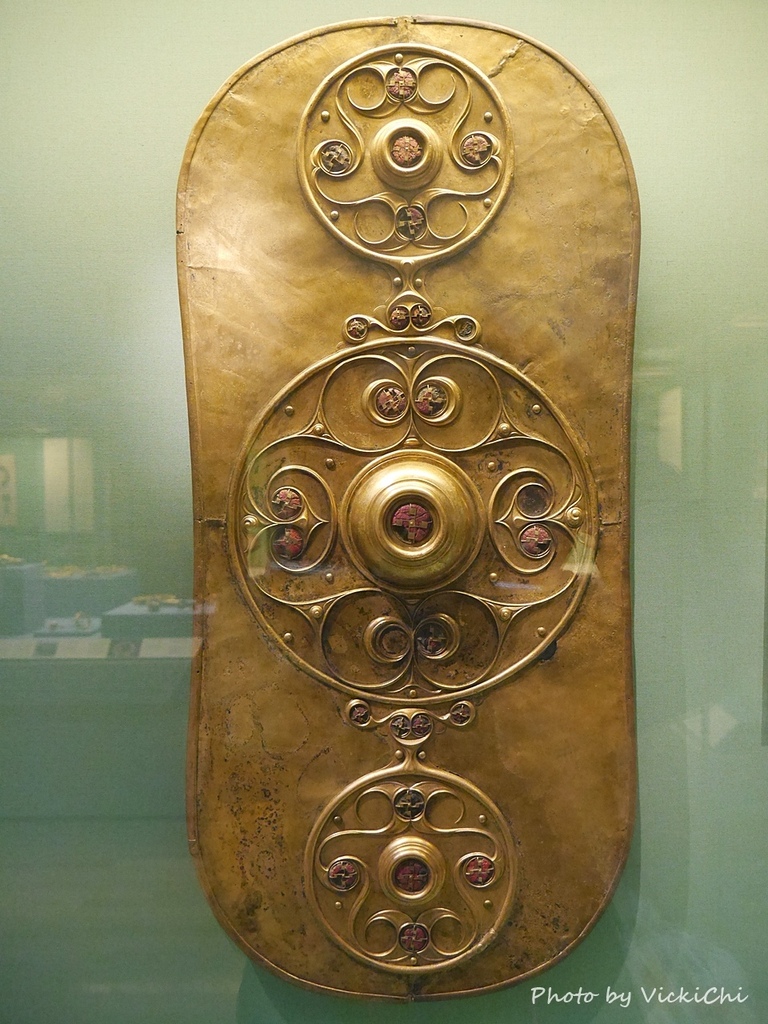 上面鑲嵌琺瑯的鍍金盾,是在泰晤士河裡被發現的。原本以為這是古代上戰場的盾牌,錯!這個華麗盾牌,像是一種祭品或是向河神許願的貢品。