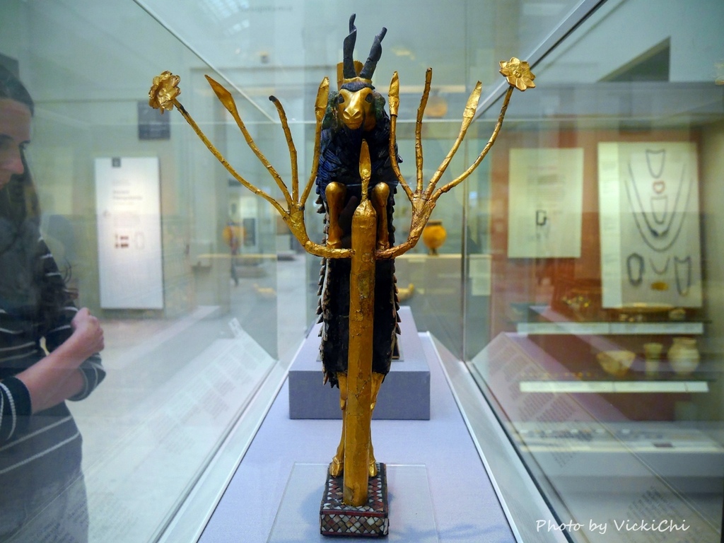 45.7公分高的木製山羊裝飾品,是考古家李奧納多沃利在1928年的烏爾城(美索不達米亞的蘇美爾古城)裡的皇室陵墓中發現的雕刻品。原本我以為是用來類似衣架用途,不過是在墓室發現,我想就是某件物品上的雕刻裝飾。