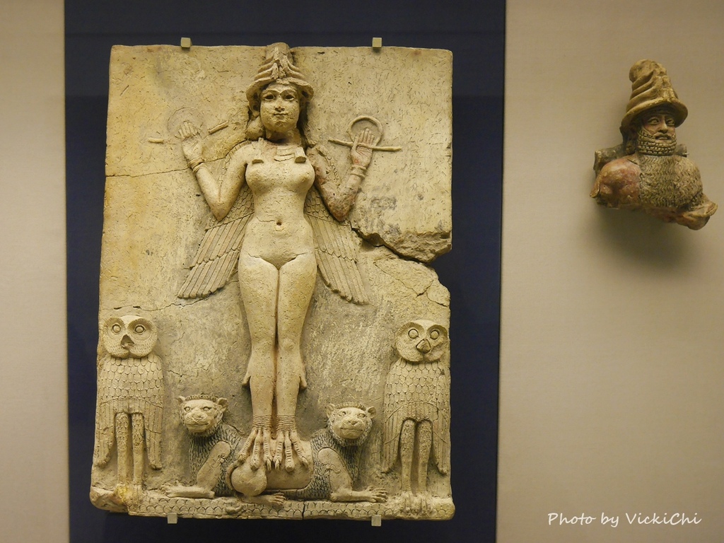 這件夜之女王的泥板浮雕,是掌管性愛與戰爭的女神伊絲塔(Ishtar)。浮雕可能在約西元前1792年,來自於美索不達米亞文化,用烤過的稻草磨礪粘土所製作而成的,可能以前是放在神社裡。