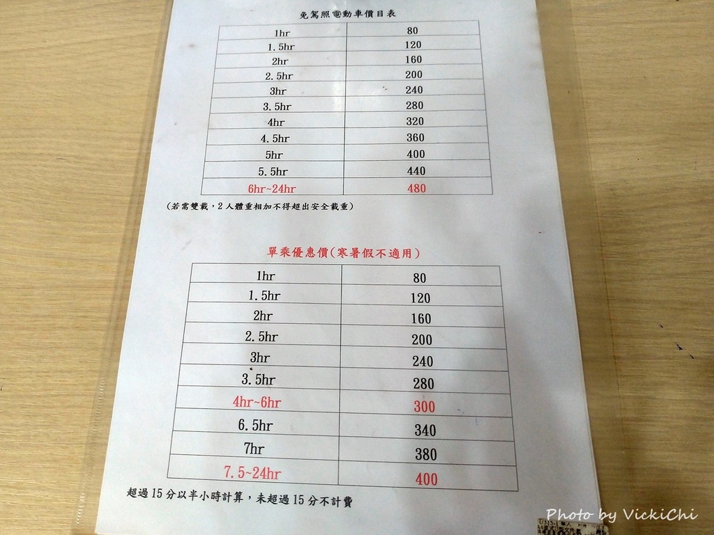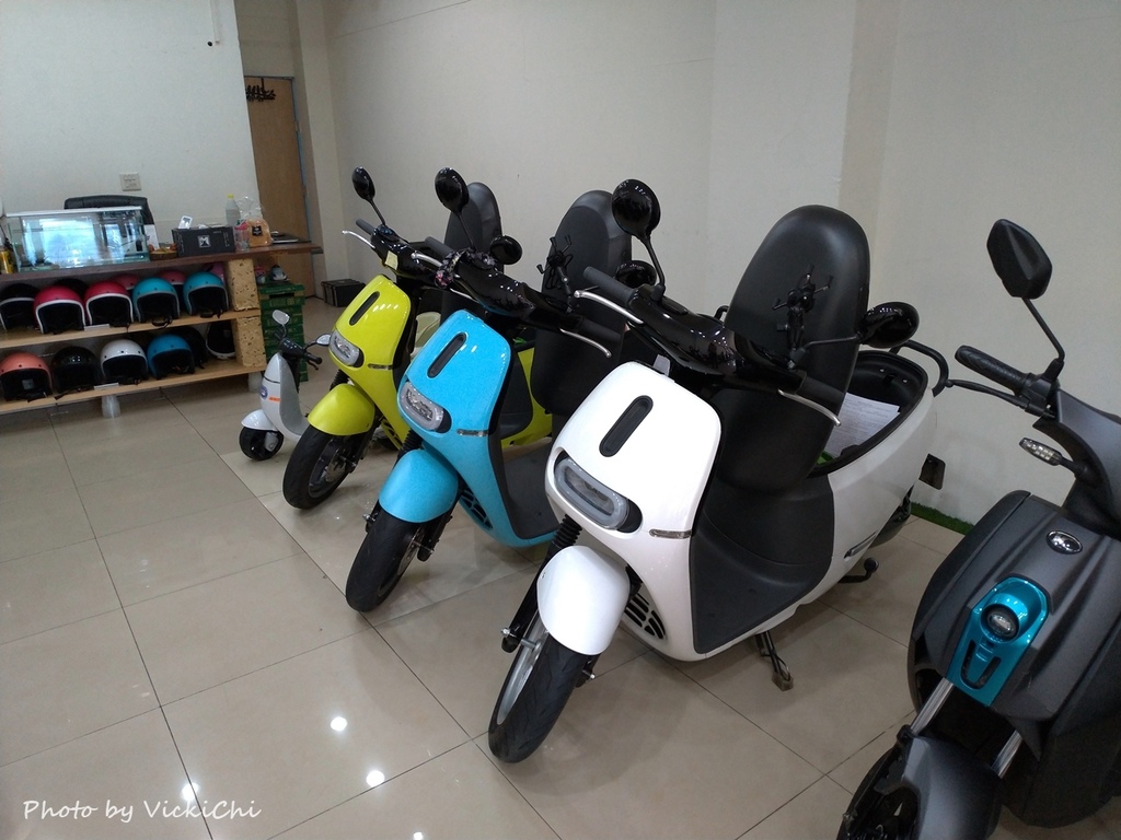 租車行裡面總共提供兩種電動車租用,有免駕照的電動車和Gogoro。免駕照的電動車的最大行駛速率時速25KM以下,一小時以80元計,剛好看到幾位大學生出租這款電動車,老闆跟我說這款比較適合在市區閒晃。而我想騎到四草去,老闆推薦我租Gogoro比較好,Gogoro的款式也有好幾種,還有計算其他里程數加能源費等等,最後,我租最一小時100元計費的基本款。