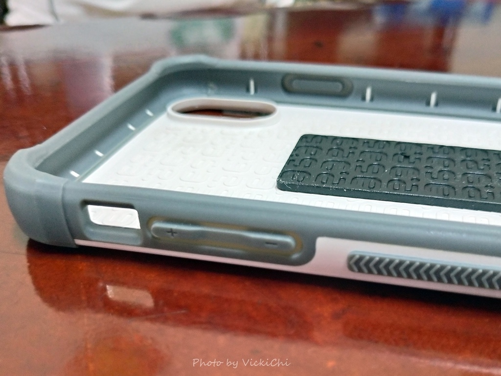 雙邊的按鍵設計一樣很仔細,比起之前買的保護套更為精緻,架上自拍棒就不怕壓到旁邊的按鍵。
