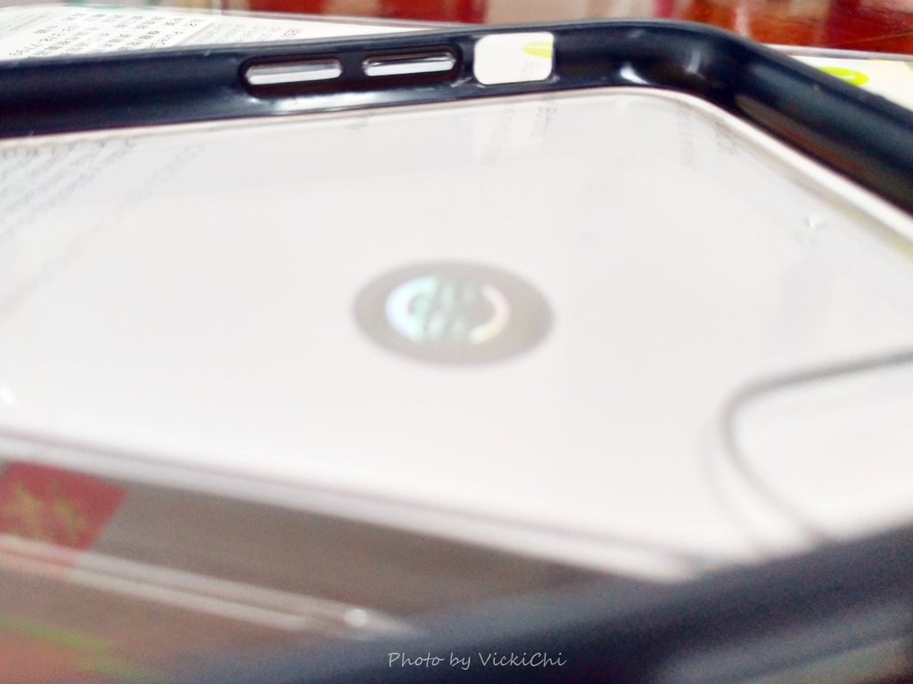 保護殼中間有一塊墊子,推想應該是要讓螢幕的正面高於邊緣,這樣就可以加強螢幕保護。這點也是我覺得這款保護殼很棒的設計,針對四角升級防摔氣墊也不錯,把手機安穩地包護著。
