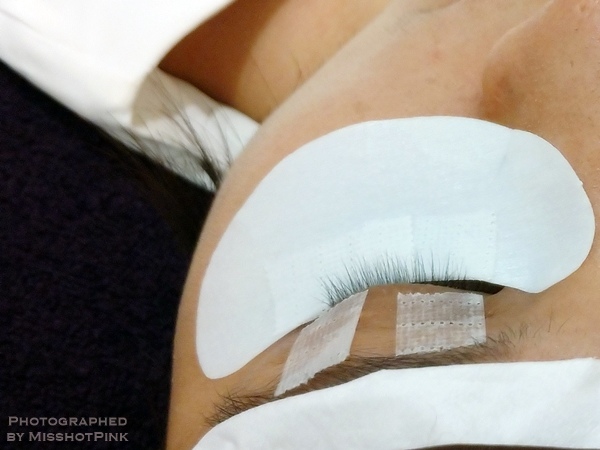 接睫毛前,美睫師幫我清潔眼部和貼眼貼,涼涼的眼貼除了可以避免接睫毛的時候黏到下睫毛,用紙膠把眼頭、眼尾各粘貼固定。