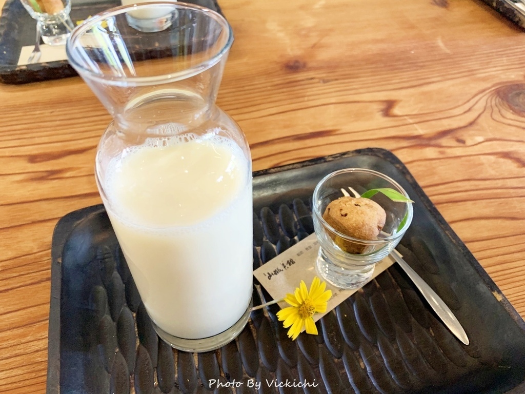 黃豆和糙米製成的米豆漿,聞起來有獨特奶香味,我一度錯認成牛乳,喝的時候才發現是豆漿,搭配一塊手工鳳梨酥。