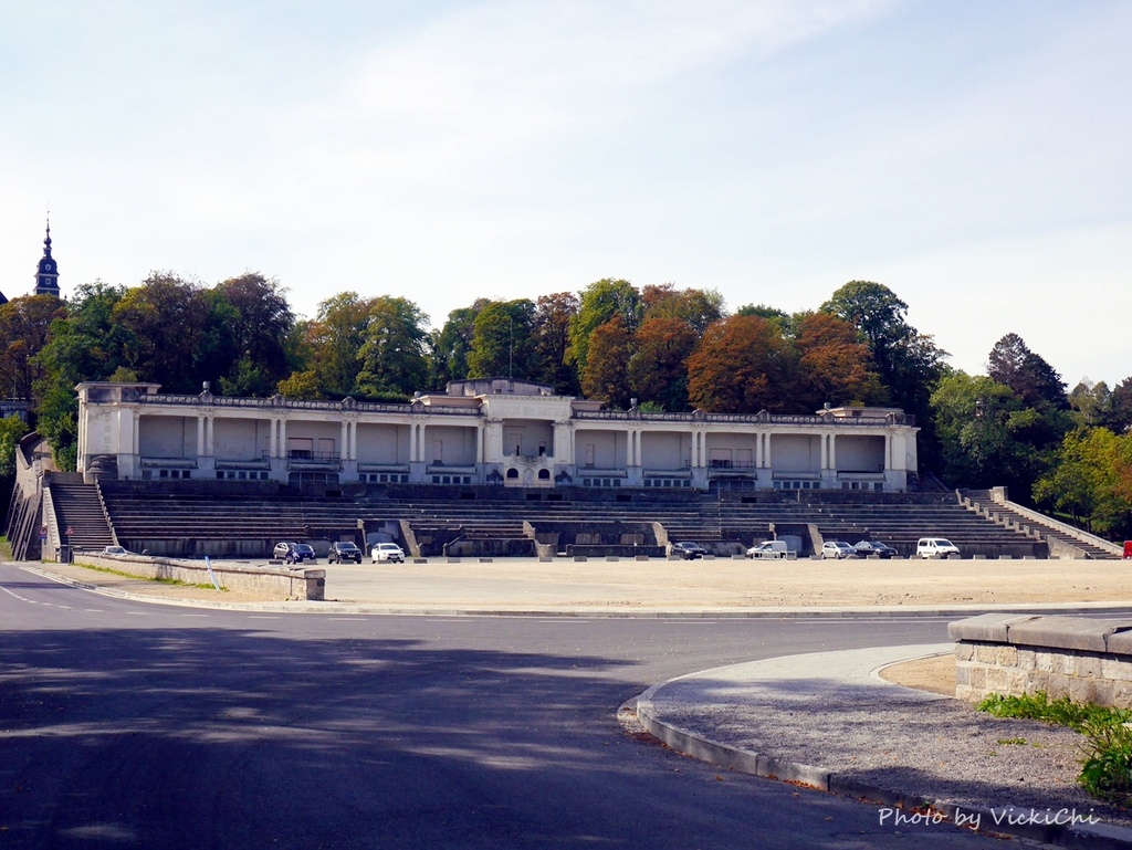 途中經過露天廣場,這個廣場是建築師喬治霍貝(Georges Hobé)在1908年設計凡爾德歌劇院(Thétrede Verdure),採露天設計的歌劇院,這裡時常舉辦歌劇、舞蹈、音樂會等節目,到1985年後,Verdur搖滾音樂節都會在這裡舉辦。沒有音樂會的日子,這裡就變成停車場。