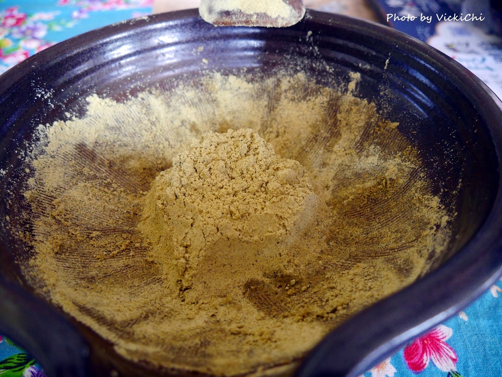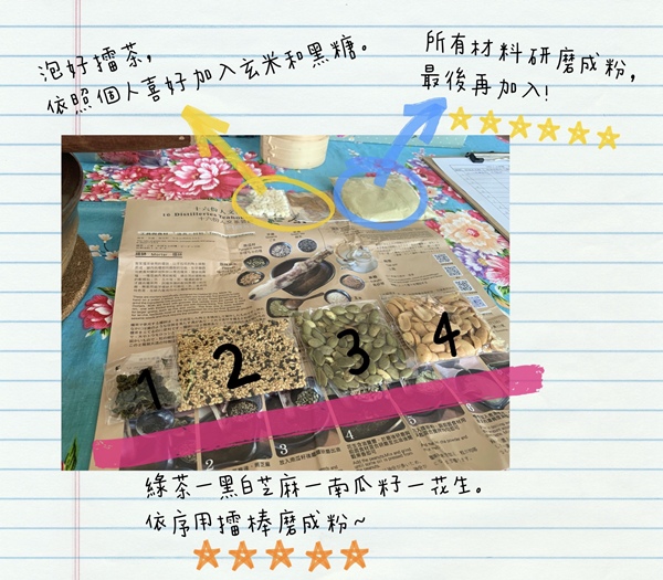 在擂南瓜籽和花生的時候會出油,最後磨完會呈現黏黏的狀態。加入擂茶粉,加水擂茶就完成了!材料包裡的玄米、黑糖,就是依照個人喜好添加囉。