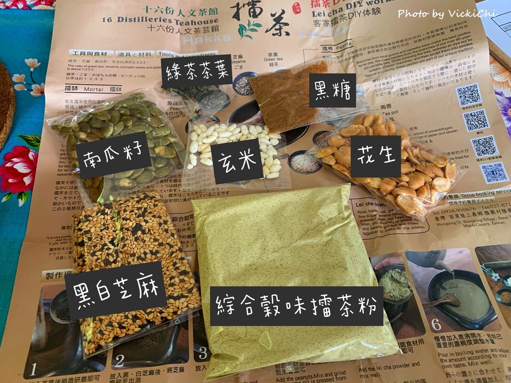 擂茶材料包上有詳細的擂茶DIY說明,裡面包含了8種材料,有綠茶茶葉、南瓜籽、玄米、炒過的黑白芝麻(使用炒過的芝麻,香氣更容易出來!)、花生、黑糖還有一包粽合穀類的擂茶粉。