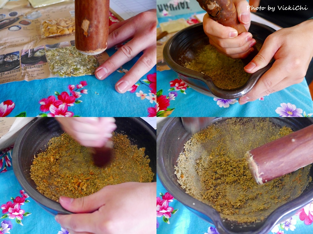 店員幫我排好材料的順序,擂茶不是所有材料一次梭哈後,直接擂就好。要依序把綠茶茶葉、店家事先炒過的黑白芝麻、南瓜籽、最後再倒入花生,磨得越碎越好!!!