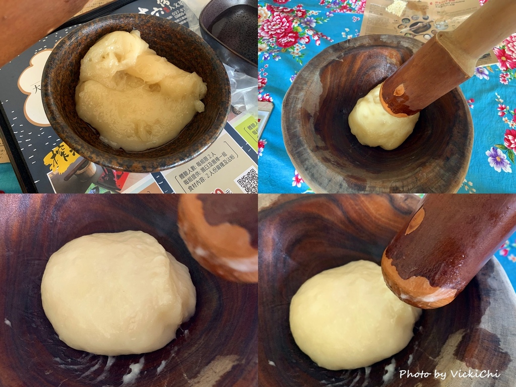 先在杵臼上面抹水,木杵以上下的方式搗麻糬,如果發現麻糬太黏後,就沾點水。連續搗15-20分鐘。一個人麻糬搗的非常累,還好有工作人員在旁邊協助我一起搗。